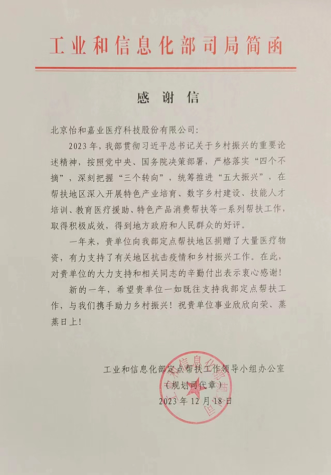 优质医疗资源下沉是全面推进健康中国建设的迫切要求,怡和嘉业深感荣幸能参与其中。近日,一封来自工业和信息化部的感谢信寄到了怡和嘉业。信中,工信部称赞怡和嘉业“向我部定点帮扶地区捐赠了大量医疗物资,有力支持了有关地区抗击疫情和乡村振兴工作。”怡和嘉业的公益之举,再次获得高度肯定。